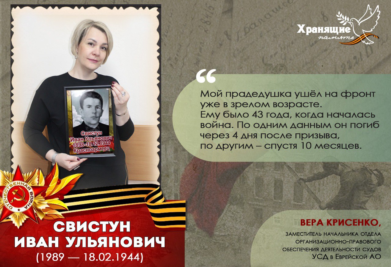 Продолжаем серию публикаций проекта Управления Судебного департамента в Еврейской автономной области, в котором сотрудники рассказывают о судьбе и боевых подвигах своих родных во время Великой Отечественной войны 1941–1945 гг., их послевоенной мирной жизни, делятся воспоминаниями. Вера Александровна КРИСЕНКО, заместитель начальника отдела организационно-правового обеспечения деятельности судов, - о прадедушке Иване Ульяновиче СВИСТУНЕ. "Мой прадедушка ушел на фронт уже в зрелом возрасте. Когда началась война, ему было 43 года. Много лет он работал участковым. По одним данным прадед погиб через 4 дня после призыва, по другим – спустя 10 месяцев. Кроме единственной фотографии и именного списка безвозвратных потерь личного состава, содержащего сведения о его гибели, - у нашей семьи нет данных. Но мы продолжаем хранить память о нем". ![]() |