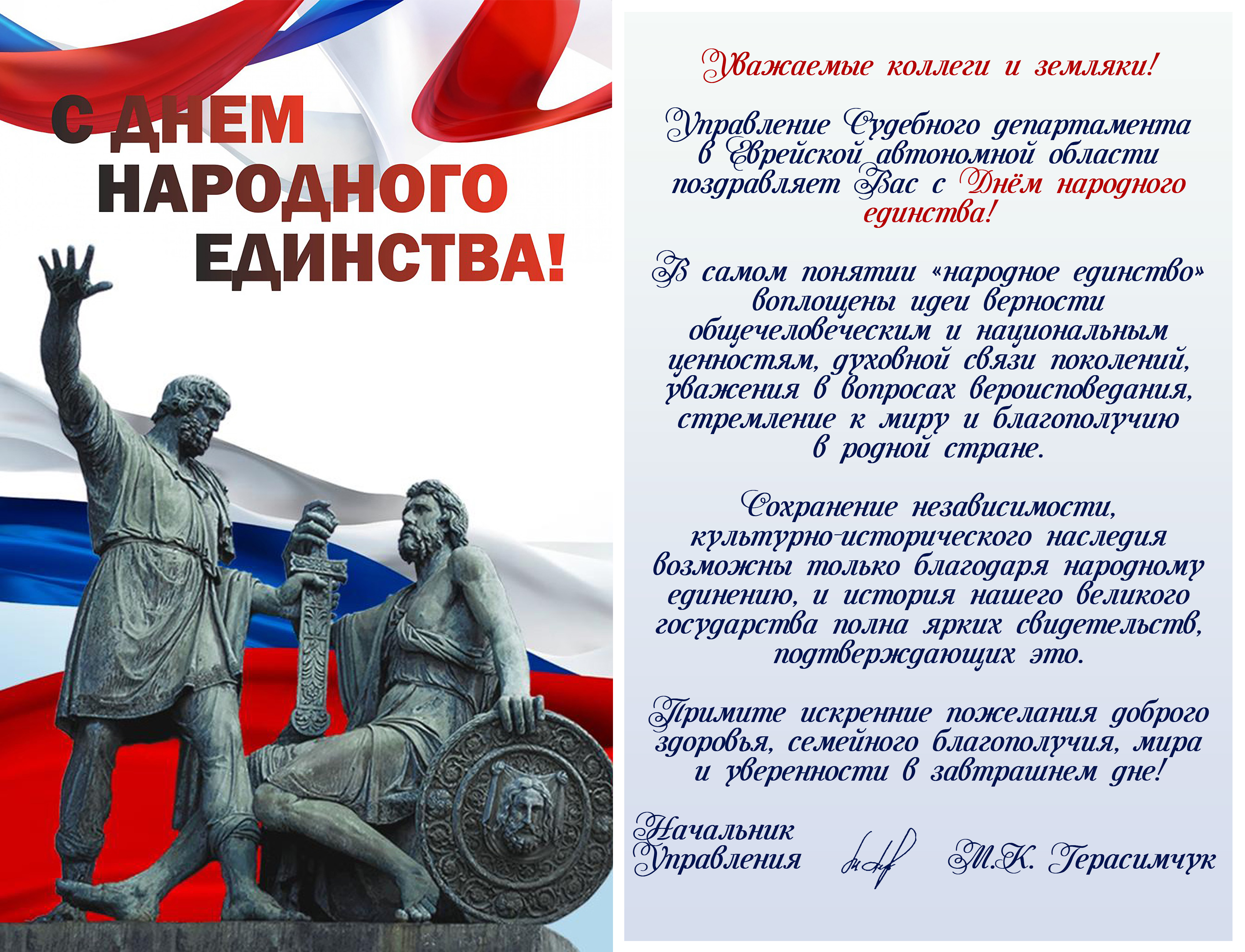 Поздравление начальника УСД в Еврейской АО Марины Корнеевны ГЕРАСИМЧУК с Днем народного единства!версия для печати